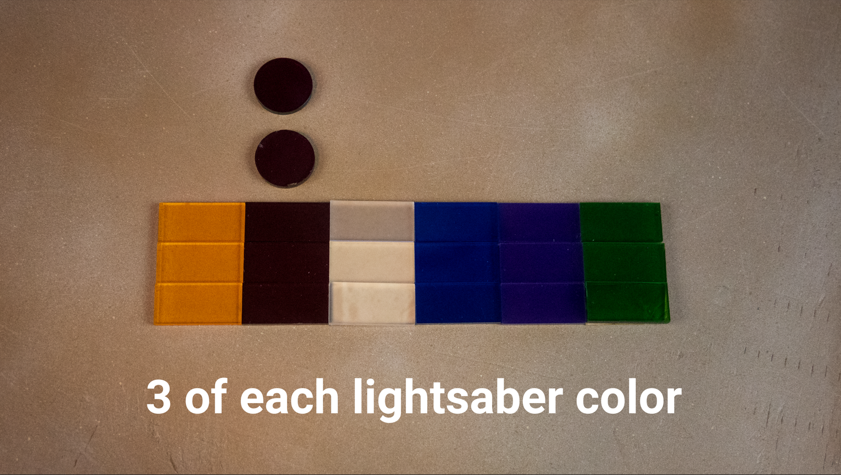 Comes with 3 of each lightsaber colored acrylic to change the light to match the crystal, and two red acrylic discs for the top.