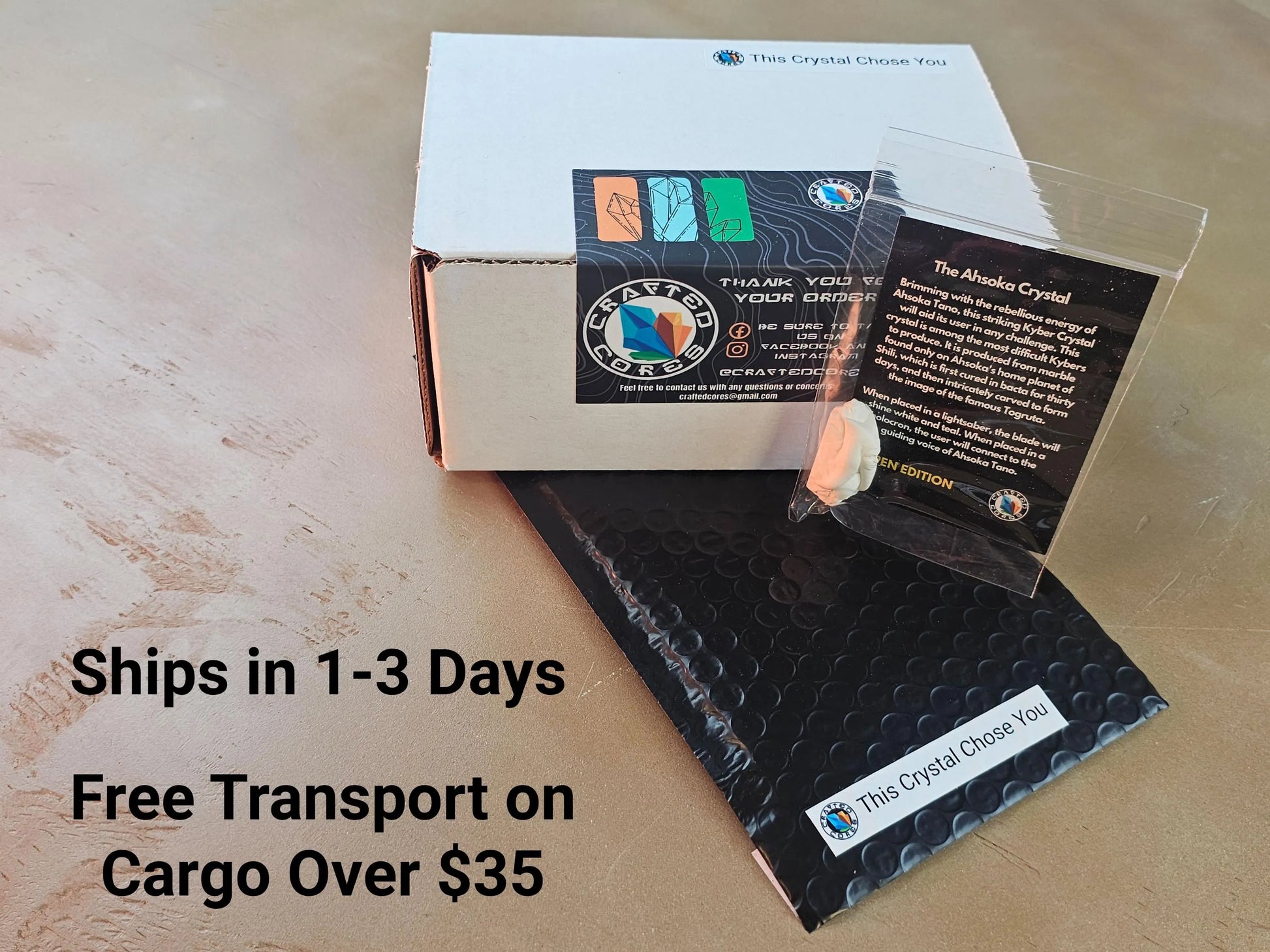 Inspired by the clarity and conviction of Ahsoka Tano, this handcrafted kyber crystal features a unique stone-like texture created with granite powder, giving it a raw, natural feel. The blade ignites in either a crisp white or a rare teal blue, depending on orientation—both a nod to her journey from Padawan to independent Force wielder. Voiced by Ahsoka herself, this Savi’s-compatible crystal adds a bold and elegant touch to any saber build, ideal for collectors or duelists seeking balance, grace, and strength.
