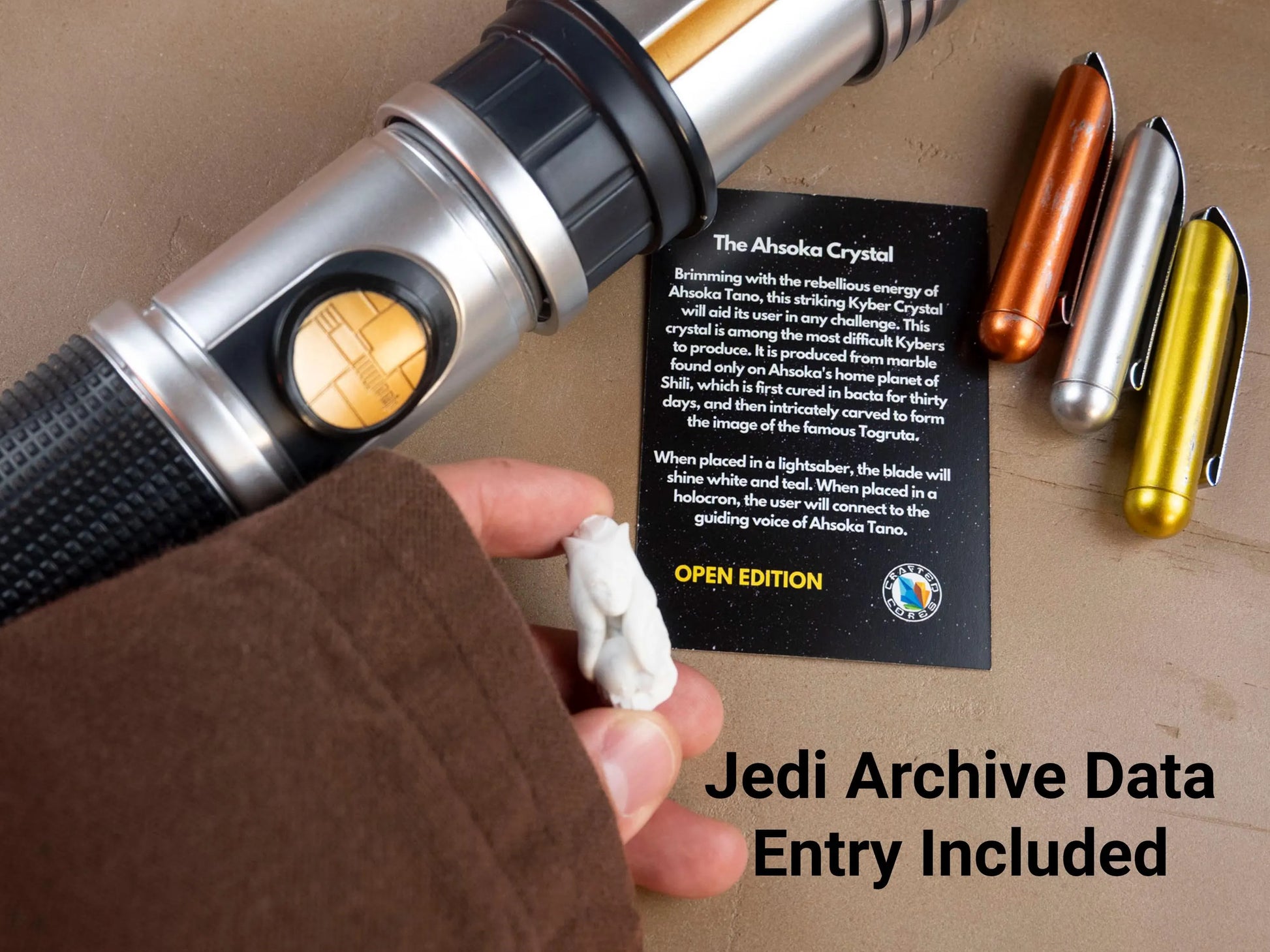 Fully compatible with Galaxy’s Edge Savi’s Workshop lightsabers and Disney Holocrons.