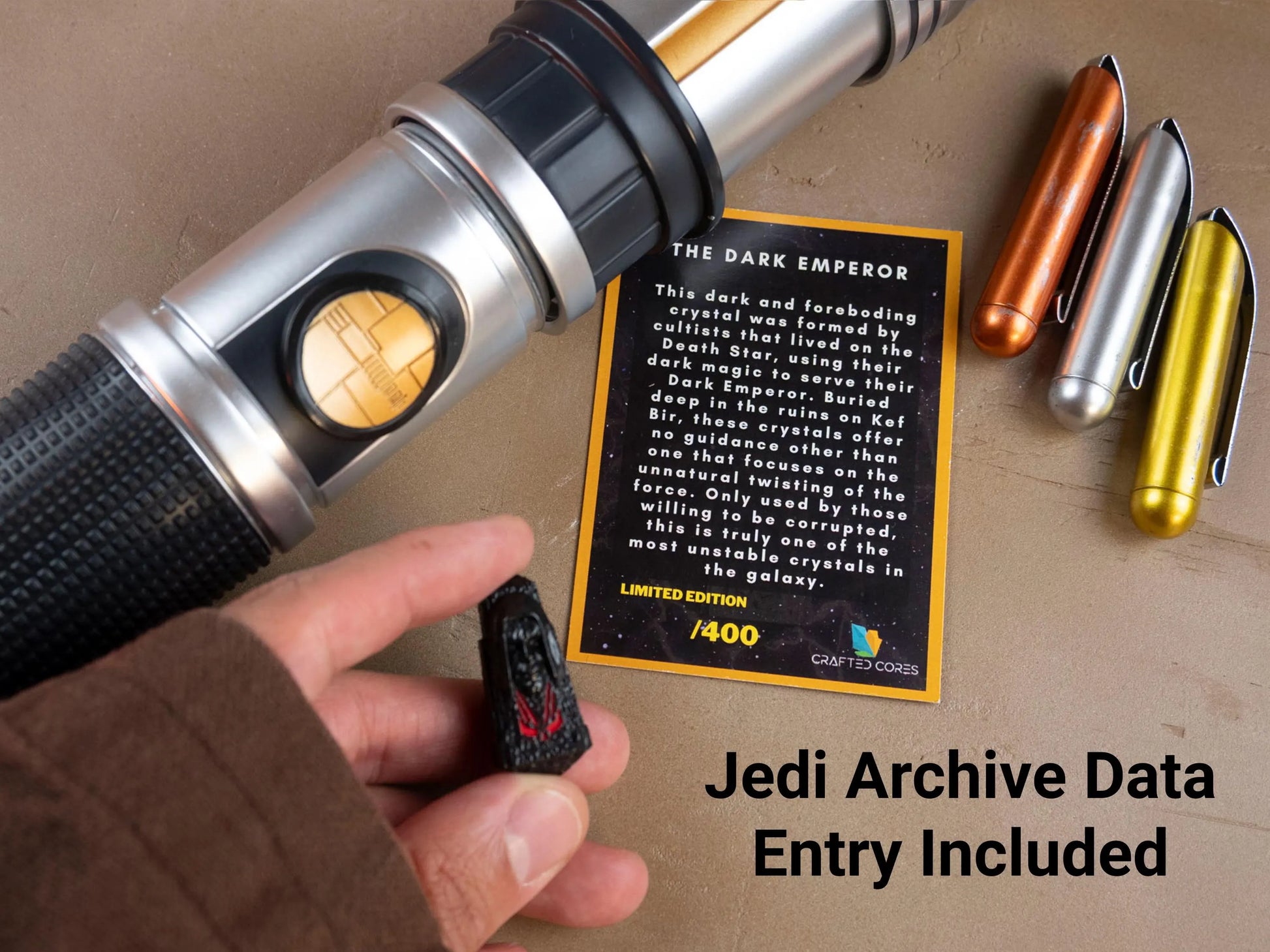 Fully compatible with Galaxy’s Edge Savi’s Workshop lightsabers and Disney Holocrons.